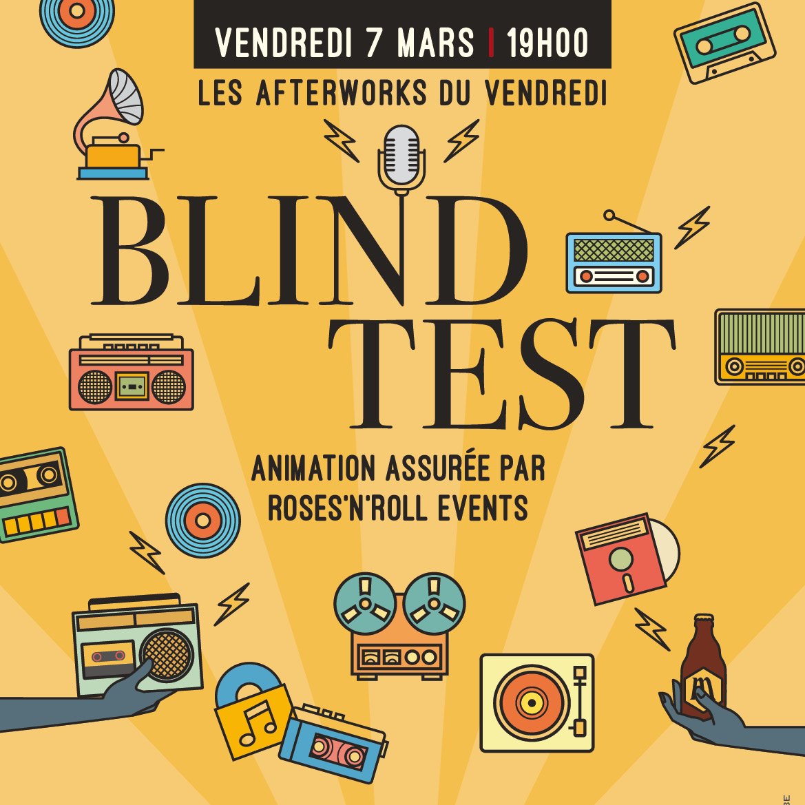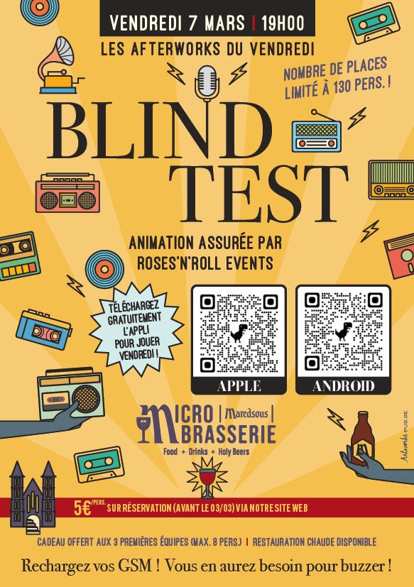 Blind Test » Roses’N’roll Events « LES AFTERWORKS DU VENDREDI Soirée Blind Test 7 mars 2025 à 19h Roses'N'roll Events Maximum des tables de 8 personnes Coût 5 € par personne Télécharger à l'avance l’appli QuizzXpress Smart Buzzer (android ou apple) Prix aux 3 premiers groupes Possibilité de restauration sur place Réservation pour le 3 mars au plus tard Nombre de places limitées Réservation en ligne pour le 03/03 au plus tard RESERVATION EN LIGNE Étiquettes : Musique Date 07 Mar 2025 Expiré! Tarif 5.00€ Lieu Microbrasserie de Maredsous Catégorie Afterworks du vendredi agenda maredsous Organisateur Abbaye de Maredsous Partagez cet événement
